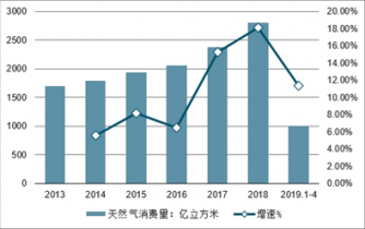 2013-2019年中國天然氣消費(fèi)量及同比增長走勢(shì)