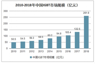 2016年中國IGBT市場規(guī)模105.4億元,2017年中國IGBT市場規(guī)模132.5億元,2018年達(dá)到261.9億元。