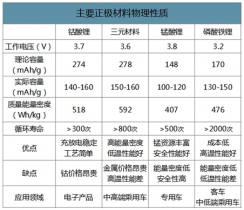 磷酸鐵鋰循環(huán)性能最好,循環(huán)壽命超過2000次,成本優(yōu)勢明顯;三元材料的理論容量278mAh/g、實際容量160mAh/g以上,能量密度優(yōu)勢突出,但安全性較弱、循環(huán)壽命欠佳。