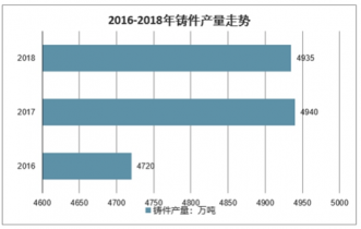 世界鑄件產業向發展中國家轉移,發展中國家的生產能力增強、在全球的市場份額擴大。我國經濟穩步發展、基礎設施完善、鑄件下游需求拉動等因素的帶動下,我國鑄件產量經歷2016年的低谷后,2018年我國鑄件產量達4935萬噸。