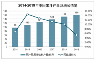 2018年,中國(guó)果汁及果汁飲料產(chǎn)量為152億升,同比增長(zhǎng)10.1%。結(jié)合2019年果汁行業(yè)市場(chǎng)發(fā)展情況來看,預(yù)計(jì)2019年中國(guó)果汁及果汁飲料產(chǎn)量將達(dá)到160億升。