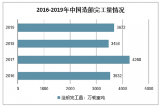 2013年以來,我國造船完工量維持在3000-4500萬載重噸之間。2019年,全國造船完工量為3672萬載重噸,同比2018年增長6.2%。