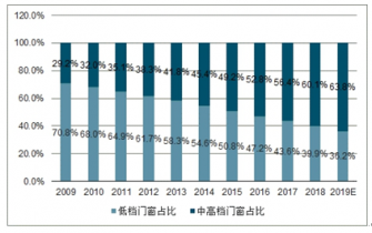 2009-2019年中國(guó)低檔與中高檔門窗五金市場(chǎng)規(guī)模占比情況