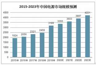 界電源市場的總規模不斷增長, 2015年全球電源市場規模達 904.9 億美元,其中開關電源達384.6億美元。伴隨著我國經濟的持續快速增長,我國電源產業呈現良好的發展態勢, 2016 年中國電源市場規模首次突破2,000億大關,達2,056億元,同比增長 6.9%,2018 年,中國電源市場的規模達到2,459億元,同比增長 5.95%,并預計到2023年,其市場規模將增至 4,221 億元。