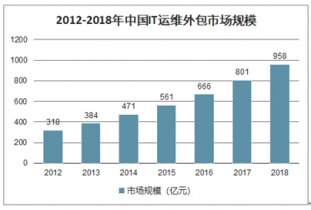 2012年中國IT運維外包市場規(guī)模已達(dá)313億元。2015年中國IT運維外包市場規(guī)模達(dá)到561億元。到了2016年中國IT運維外包市場規(guī)模達(dá)到了666億元,截止至2017年中國IT運維外包市場規(guī)模增長超800億元。2012-2017年復(fù)合增長率高達(dá)20.3%。到了2018年底中國IT運維外包市場規(guī)模達(dá)到了958億元,同比增加19.5%。