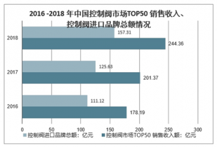 2016 -2018 年中國控制閥市場TOP50 銷售收入、控制閥進口品牌總額情況