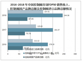 2016 -2018 年中國控制閥市場TOP50 銷售收入、控制閥國產品牌總額及控制閥進口品牌總額情況