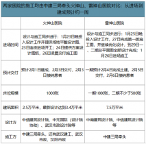 火神山、雷神山醫(yī)院的設(shè)計(jì)主要由中信建筑設(shè)計(jì)院、中南建筑設(shè)計(jì)院等完成火神山醫(yī)院的設(shè)計(jì)由中信建筑設(shè)計(jì)院完成,并由參與過(guò)北京小湯山醫(yī)院的中元國(guó)際設(shè)計(jì)院協(xié)助,武漢市政設(shè)計(jì)院承接雨水、污水排放設(shè)計(jì)任務(wù);雷神山醫(yī)院的設(shè)計(jì)由中南建筑設(shè)計(jì)院、中信建筑設(shè)計(jì)院等合作完成。這兩家醫(yī)院的施工均由中建三局牽頭火神山、雷神山醫(yī)院對(duì)比:從進(jìn)場(chǎng)到建成預(yù)計(jì)約一周