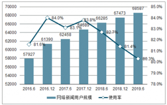截至2019年6月,我國網絡新聞用戶規模達6.86億,較2018年底增長1114萬人,占網民整體的80.3%;手機網絡新聞用戶規模達6.6億,較2018年底增長734萬,占手機網民的78.00%。