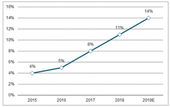2015-2019年中國外賣行業交易額占全國餐飲收入比重