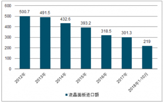 2012-2017年,我國液晶面板進口額不斷下降,2017年為301.3億美元,同比下降5.4%;2018年1-10月,我國液晶面板進口額為219.0億美元,同比下降10.4%。