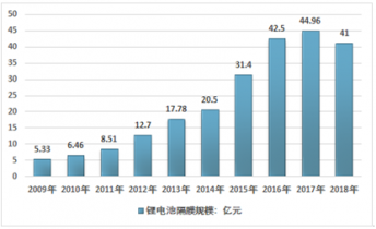 近幾年國內鋰電池隔膜行業市場規模整體呈現增長態勢,從2009年的5.33億元增長到了2018年的41億元。如下圖所示: