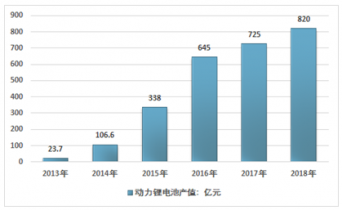 2013年我國動力鋰電池市場產值規模約23.7億元,到2018年國內動力電池市場產值規模達到了820億元。近幾年我國動力電池市場產值規模情況如下圖所示: