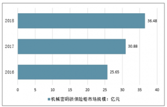 2018年我國機械密碼鎖保險柜行業市場規模約36.48億元,同比2017年的30.88億元增長了18.13%。