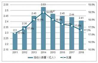 2011-2018年中國流動人口規(guī)模及占全國總?cè)丝诒戎刳厔?/span>