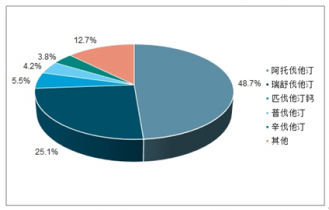 2018年,在國內降血脂藥物中,阿托伐他汀所占份額最高,達48.7%;瑞舒伐他汀其次,占比25.1%;匹伐他汀鈣、普伐他汀、辛伐他汀占比則在6%以下,其他占比12.7%。