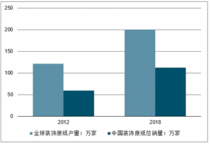 2012 -2018年全球裝飾原紙產(chǎn)量及中國裝飾原紙總銷量情況
