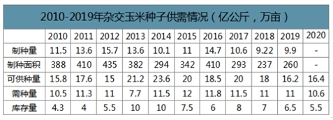 2010-2019年雜交玉米種子供需情況(億公斤,萬畝)