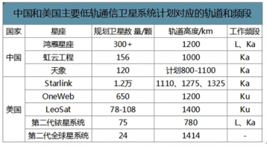 中國(guó)和美國(guó)主要低軌通信衛(wèi)星系統(tǒng)計(jì)劃對(duì)應(yīng)的軌道和頻段