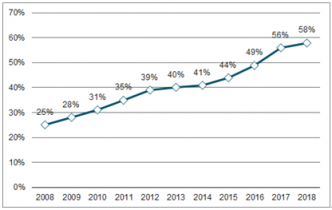 2008-2018年中國逆變焊接產品市場占電弧焊接產品市場比重