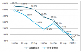 2013-2019H1中國凈水器市場銷售額及銷售量增速
