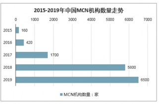 2016年我國MCN機構(gòu)數(shù)量尚不足500家,到2017年飛速增至1700家,2018年更是一舉突破5000家。到2019年,我國MCN機構(gòu)數(shù)量達到6500家,比2018年增加700家。