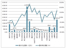 2019年前三季度機械各細分行業營收及其同比增速(億元,%)
