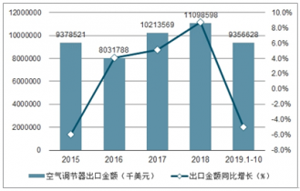 2015-2019年1-10月中國空氣調(diào)節(jié)器出口金額及增速趨勢圖