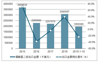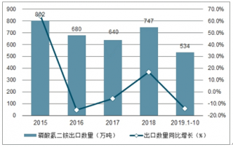 2019年1-10月中國磷酸氫二銨出口數量為534萬噸,同比下降13.9%;2019年1-10月中國磷酸氫二銨出口金額為1956585千美元,同比下降23.5%。