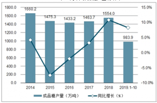 2019年1-10月中國成品糖產(chǎn)量及增速統(tǒng)計表