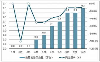 2019年1-10月中國繡花機累計進口數量及增速趨勢圖