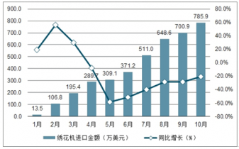 2019年1-10月中國繡花機累計進口金額及增速趨勢圖