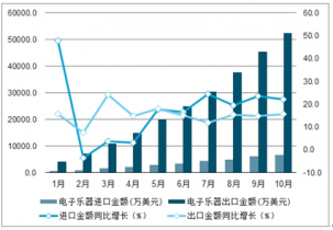 2019年1-10月中國電子樂器累計進出口金額及增速趨勢圖