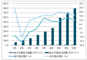 2019年1-10月中國電子樂器累計進出口數(shù)量及增速趨勢圖