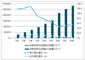2019年1-10月中國(guó)動(dòng)物玩具及玩偶累計(jì)進(jìn)出口數(shù)量及增速趨勢(shì)圖