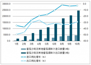 2019年1-10月中國番茄沙司及其他番茄調味汁累計進出口數量及增速趨勢圖