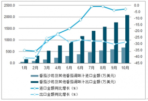 2019年1-10月中國番茄沙司及其他番茄調味汁累計進出口金額及增速趨勢圖