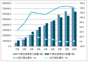 2019年1-10月中國干果及堅果累計進出口數量及增速趨勢圖
