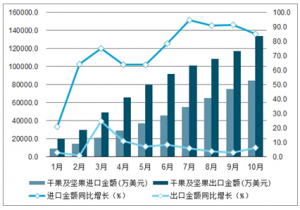 2019年1-10月干果及堅果進口數量為717078.1噸,同比增長142%;出口數量為643737.7噸,同比增長1.6%。2019年1-10月干果及堅果進口金額為84541.4萬美元,同比增長85.2%;出口金額為134026.7萬美元,同比增長6.4%。