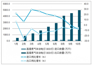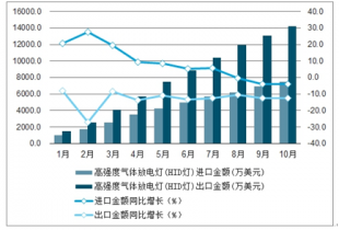 2019年1-10月中國高強度氣體放電燈(HID燈)累計進出口金額及增速趨勢圖