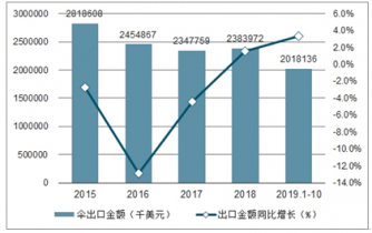 2015-2019年1-10月中國傘出口金額及增速趨勢圖