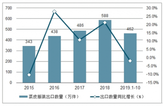 2015-2019年1-10月中國裘皮服裝出口數(shù)量及增速趨勢圖