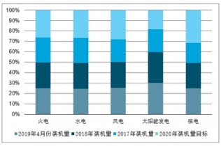 截至2019年4月底,全國全口徑發(fā)電機(jī)裝機(jī)容量為19.15億千瓦,火電裝機(jī)容量為11.48億千瓦,目前結(jié)構(gòu)占比59.98%,相較于2015年的64.9%,下降了接近5個百分點(diǎn);水電裝機(jī)容量為3.5億千瓦,目前結(jié)構(gòu)占比18.27%,相較于2015年的20.9%,下降了2.6個百分點(diǎn);風(fēng)電裝機(jī)容量為1.9億千瓦,目前結(jié)構(gòu)占比9.93%,相較于2015年的8.5%,上升了1.43個百分點(diǎn);太陽能發(fā)電裝機(jī)容量為1.8億千瓦,目前結(jié)構(gòu)占比9.43%,相較于2015年的2.8%,上升了6.63個百分點(diǎn);核電裝機(jī)容量為0.46億千瓦,目前結(jié)構(gòu)占比2.9%,相較于2015年的1.7%,上升了1.2的百分點(diǎn)。