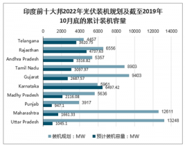 印度前十大邦2022年光伏裝機規劃及截至2019年10月底的累計裝機容量