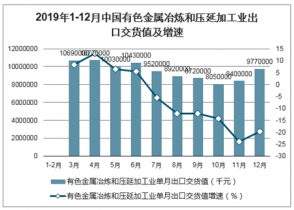2019年12月中國有色金屬冶煉和壓延加工業(yè)出口交貨值為9770000千元,同比下降19.7%;2019年1-12月中國有色金屬冶煉和壓延加工業(yè)出口交貨值為116870000千元,同比下降2.1%。
