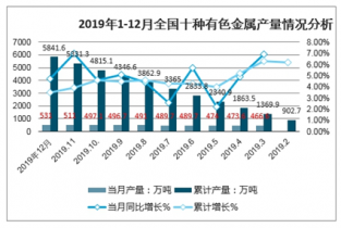 2019年中國十種有色金屬產量5842萬噸,同比增長3.5%。規上有色金屬工業增加值增長8.2%。有色行業全年投資累計增長2.1%,其中礦山投資同比增長6.8%,冶煉及加工行業投資同比增長1.2%。
