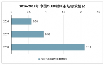 OLED的快速發展將帶動整個OLED產業鏈的快速擴張,包括制造設備、材料、組裝等產業鏈都將孕育巨大的機遇,隨著OLED面板被各大廠商應用在最新款的電子產品上,OLED產業鏈的上游功能材料也受到相應的需求刺激呈現出爆發式的增長。2012年我國OLED材料需求量約0.28噸,到2017年達到了0.93噸,2018年國內OLED材料需求量約2.11噸。預計到2020年我國OLED材料需求量將達到10噸,未來幾年國內OLED材料需求將迅猛增長。