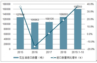 2019年1-10月中國花生油進(jìn)口數(shù)量為159350噸,同比增長37.2%;2019年1-10月中國花生油進(jìn)口金額為181649千美元,同比增長29.3%。