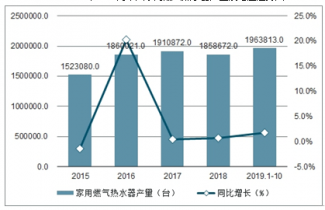 2015-2019年1-10月中國家用燃?xì)鉄崴鳟a(chǎn)量及增速趨勢圖
