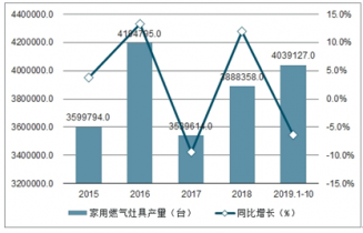 2015-2019年1-10月中國家用燃氣灶具產量及增速趨勢圖